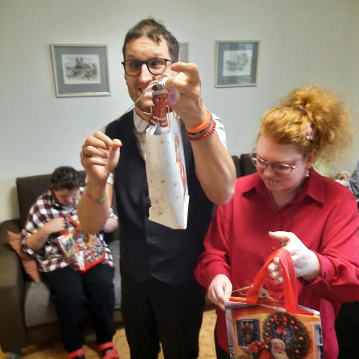 V sobotu ráno už bylo vše nakoupeno a připraveno, jenom bylo třeba rozdat úkoly, kdo bude mít co na starosti. Dámy se otáčely v kuchyni s přípravou různých pomazánek a dobrot na chlebíčky. Pánové pomáhali se sestavováním židlí a stolů. Nějaká ta výzdoba k doladění vánoční atmosféry. A pak ještě nastavení aparatury, bez níž by se večírek neobešel, kterou si vzala na starost jedna z našich pečovatelek. Odpoledne se všichni oblékli do svátečního oděvu a netrpělivě vyhlíželi první hosty. Když všichni společně zasedli ke stolu, nastala veselá a družná konverzace a sdílení zážitků minulých dnů. Došlo samozřejmě i na vzájemná přání a rozdávání drobných dárků. Radost byla veliká. Pohoštění slavnostní a bohaté. Příjemnou náladu nakonec završila hudba a tanec, při němž excelovaly hlavně dámy - Michala, Markéta a paní Petra. Ale ani pánové se nenechali zahanbit a v kole vytáčeli svoje kamarádky, nebo hosty. Bylo to velmi krásné odpoledne a setkání, podtržené vánoční atmosférou, radostí, zpěvem, tancem a pohodou. V našem domku Uhrova se tak konečně rozhostil sváteční čas vánoční, čas lásky a štěstí. Děkujeme všem a přejeme krásné Vánoce, zdraví a radost v Novém roce 2026!