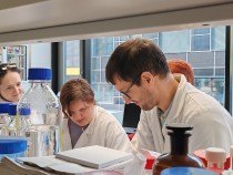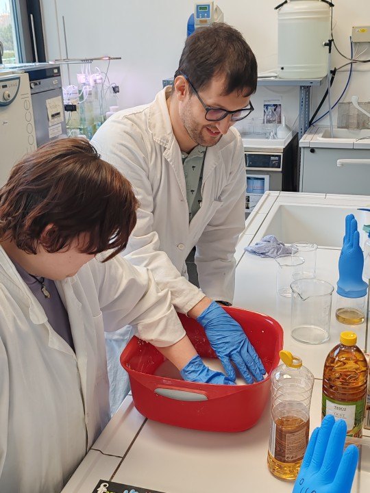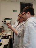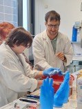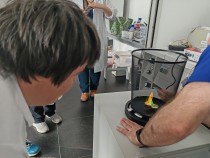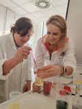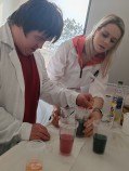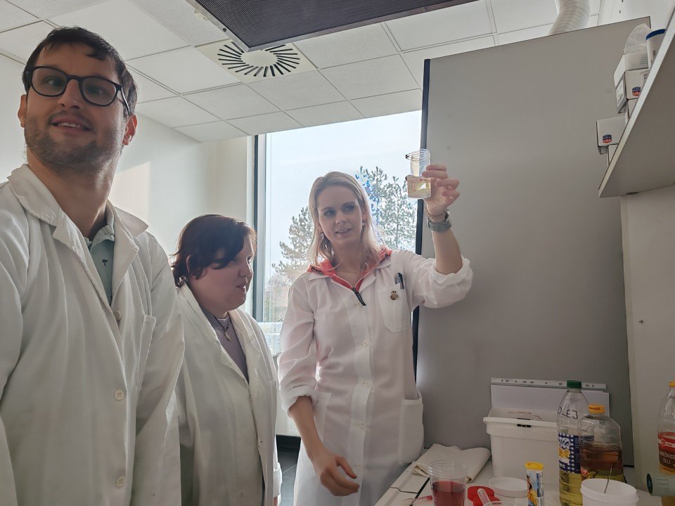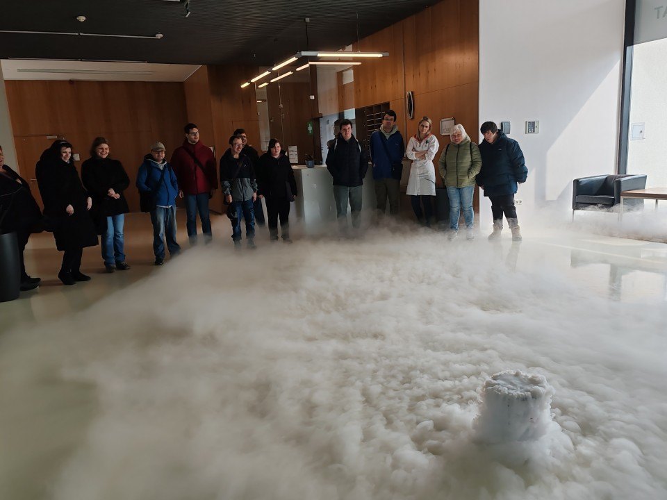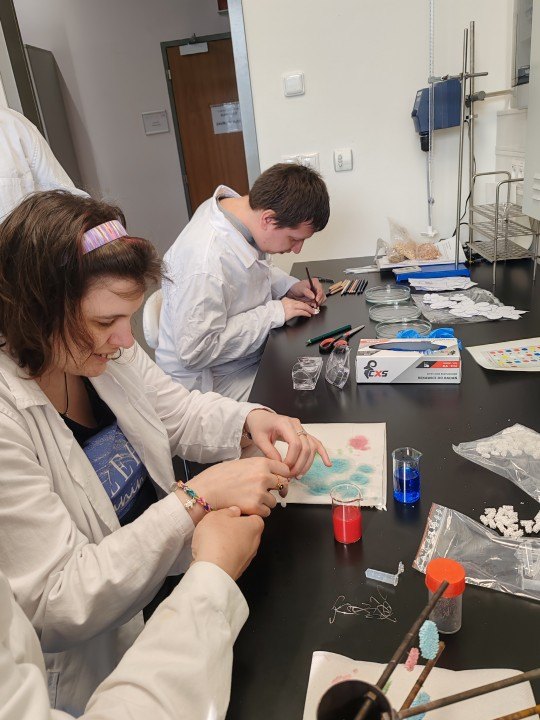Naši skupinku přivítali pracovníci Institutu a hned v úvodu nás blíže seznámili s tím, co nás v institutu čeká. Pak už se naši návštěvníci rozdělili do dvojic a každá z nich se svým doprovodem procházela laboratořemi. Mohli jsme tak osobně vidět ´kouzla´ některých chemických reakcí – např. jsme si mohli vyrobit napodobeninu lávové lampy, nafouknout gumovou rukavici bez foukání, viděli jsme i barevnou bouři ve skleněné kádince nebo jsme si mohli vyzkoušet vlastnosti tekutého písku. V každé laboratoři na nás čekalo něco překvapivého, nečekaného a zajímavého. Dopoledne nám tak uběhlo jako voda a my se museli s příjemným prostředím i našimi hostiteli pomalu rozloučit. Na konec nás čekalo ještě jedno malé překvapení ve vestibulu budovy. Hostitelé nám předvedli, jak se dá vyrobit mlha. A nad tím jsme všichni zajásali! Než jsme se rozloučili, ještě jsme se společně vyfotografovali před budovou institutu a pak už honem zpátky na tramvaj a domů. Budeme mít na co vzpomínat!